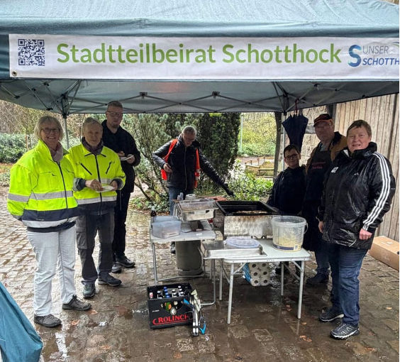 Nach gut 2 Stunden intensiven Müllsammelns trafen sich die aktiven Mitglieder des Stadtteilbeirates wieder am Schafstall. Bei Getränken und vor Ort frisch zubereiteten Kartoffelpuffern ließ man die Aktion ausklingen.